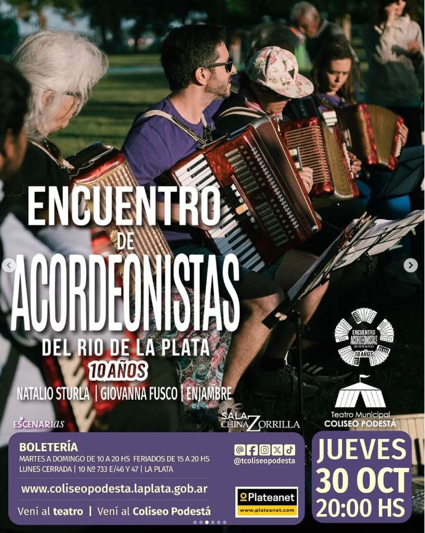 El jueves arranca la agenda con varias proyecciones destacadas en el Pasaje Dardo Rocha y el Centro Cultural Islas Malvinas , del Cine Select y EcoSelect respectivamente. El mismo día habrá peña folclórica en Guajira Bar con los Chaza , y un encuentro de acordeonistas en el Teatro Coliseo Podestá .