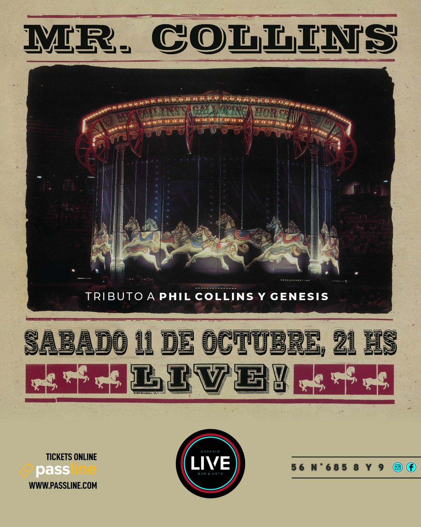 Este sábado la banda Mr Collins subirá por primera vez al escenario de Espacio Live, ubicado en calle 56 entre 8 y 9 de La Plata. El grupo rendirá tributo a Phil Collins, uno de los artistas más exitosos del mundo, con un espectáculo en vivo que recorrerá su extensa trayectoria musical.